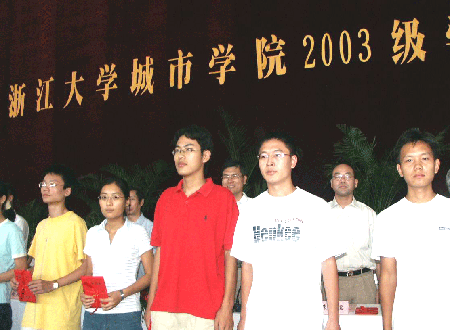 9月5日上午,浙江大学城市学院2003级开学典礼在学院风雨操场隆重举行,2896名新生兴高采烈地参加了典礼。