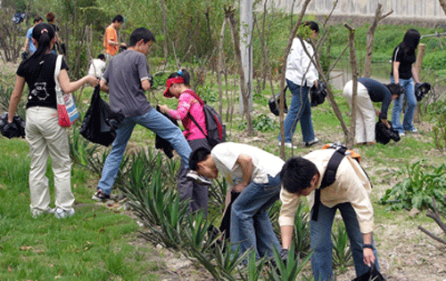 4月21日中午烈日当空,热浪逼人。在城市学院校园里,许多学生为了躲避刺眼的阳光,都撑起了阳伞。但在北校区的小河边,却活跃着一群学生,他们不顾炎热,摞起袖子,一手拿着塑料袋,一手拣着地上的杂物,为清洁校园而忙碌着。